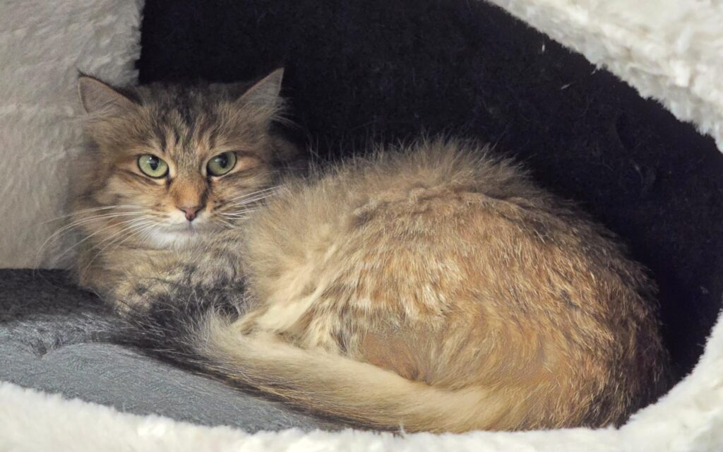 Unsere wunderschöne Ruby, geboren etwa im Mai 2022, ist eine kastrierte Katzendame – vermutlich hat bei ihr eine Norwegische Waldkatze mitgemischt.